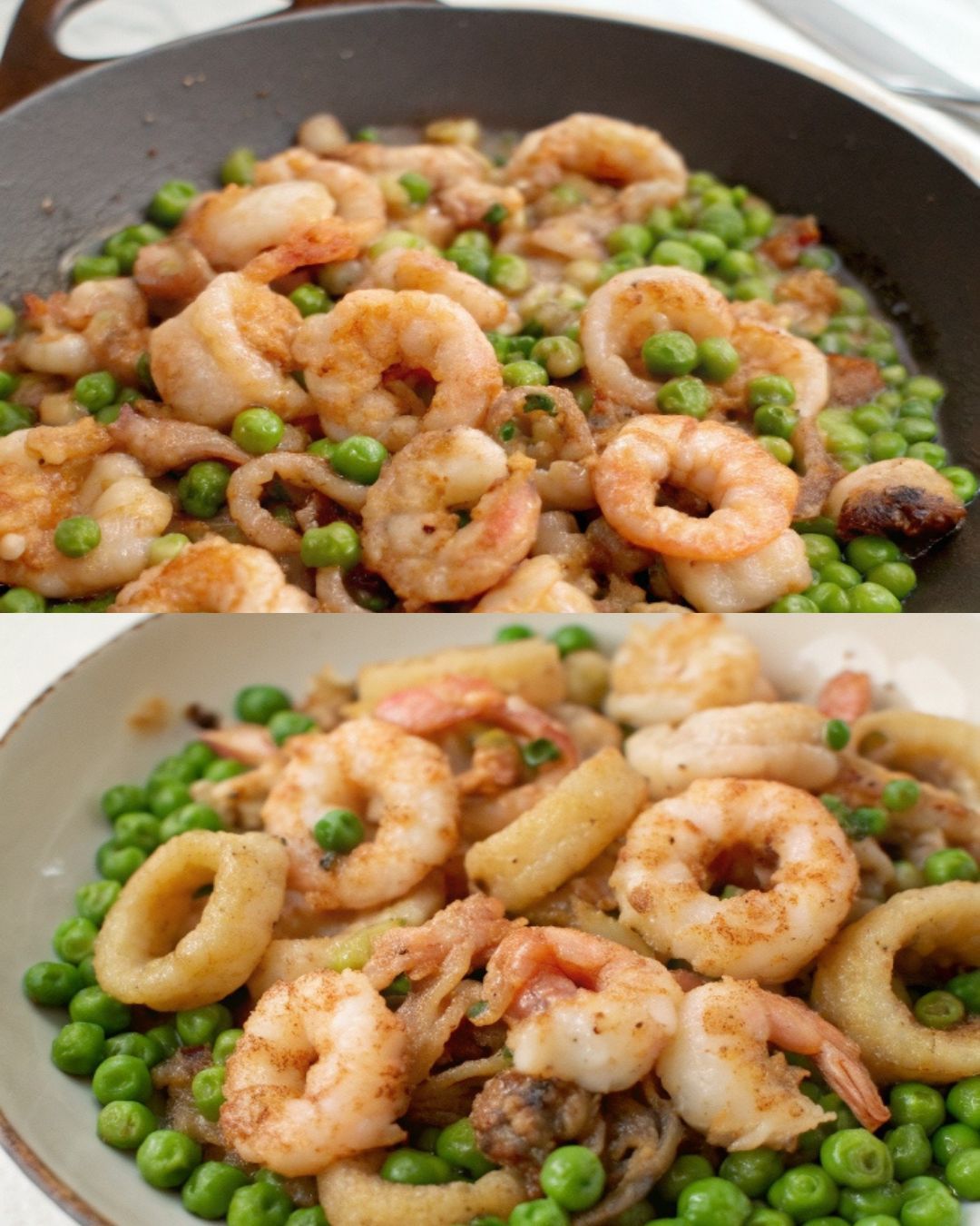 - A la mitad, añadimos los guisantes y cuando casi esté todo hecho, comprobamos que tanto los calamares como los guisantes están tiernos y añadimos las gambas peladas. Cuando cambien de color y la salsa esté espesa, retiramos y dejamos reposar al menos unos minutos.