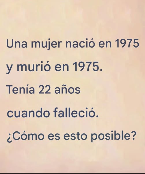 Imagina esto: te topas con esta extraña frase mientras revisas tu sección de noticias: «Una mujer nació en 1975 y murió en 1975. Tenía 22 años». Te deja paralizado. ¿Incomprensible? ¿Desconcertante? Seguro que hay algo más… ¿Pero dónde está la trampa? Agárrate fuerte, porque este enigma desafía nuestra lógica, nuestras respuestas automáticas y requiere un poco de imaginación. ¿Y si la clave fuera precisamente no pensar como solemos hacerlo?