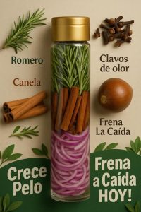 El Secreto Natural que Hace Crecer el Pelo y Frena la Caída RECETA CRECE PELO: Ingredientes: • 3 ramas de romero fresco • 1 trozo de canela en rama • 1 cucharada de clavos de olor • 1 pepa de aguacate (partida en trozos) • ½ cebolla morada en rodajas • 1 vaso de agua