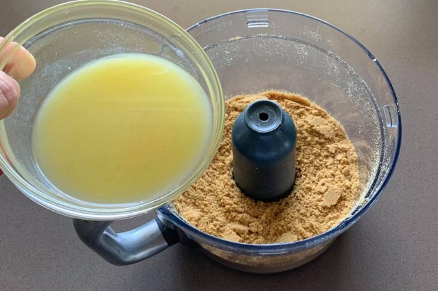 Vierte la mezcla de galletas y mantequilla derretida sobre la base de un molde desmontable de 20 cm de diámetro, forrado con una hoja de papel de horno, y nivela bien la superficie con el dorso de una cuchara.3; luego trasladar al frigorífico y dejar endurecer media hora.