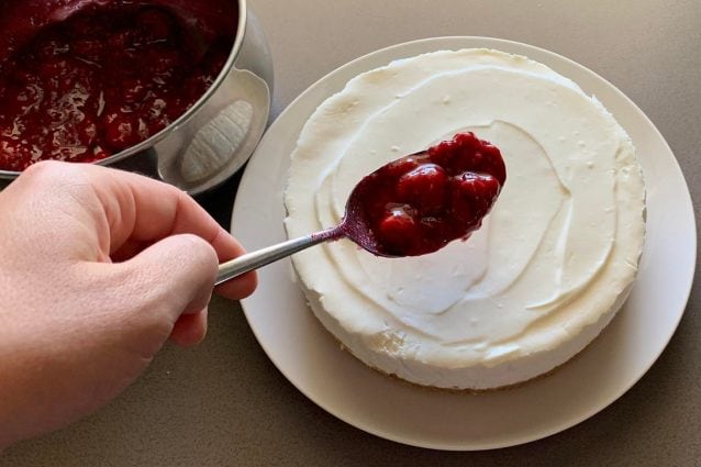 Una vez pasado el tiempo de reposo volcamos la tarta de queso en un plato de servir y esparcimos la compota de frambuesa por la superficie.12.