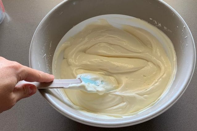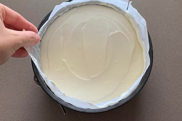 Distribuir el queso crema sobre la base de galleta, nivelar bien la superficie9y transferir a la nevera durante unas 6 horas.