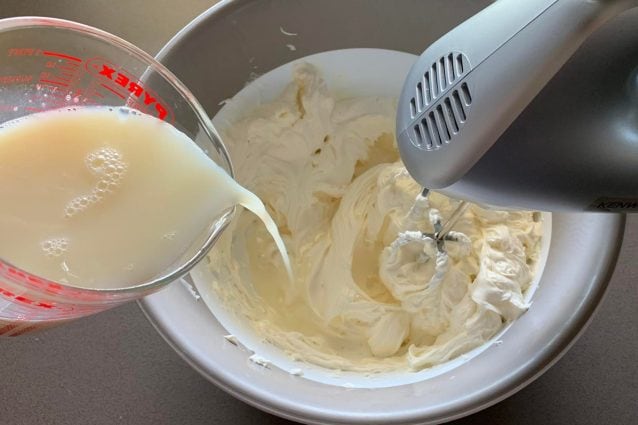 Agrega la leche azucarada poco a poco.7ya tibio, seguir batiendo con la batidora.