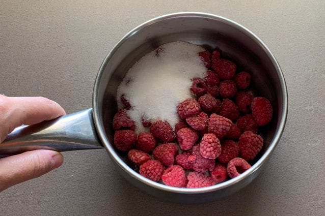 Justo antes de sacar la tarta de queso de la nevera, dedícate a preparar la cobertura. Colocar las frambuesas en una cacerola de fondo grueso junto con el azúcar y la maicena tamizada.10.