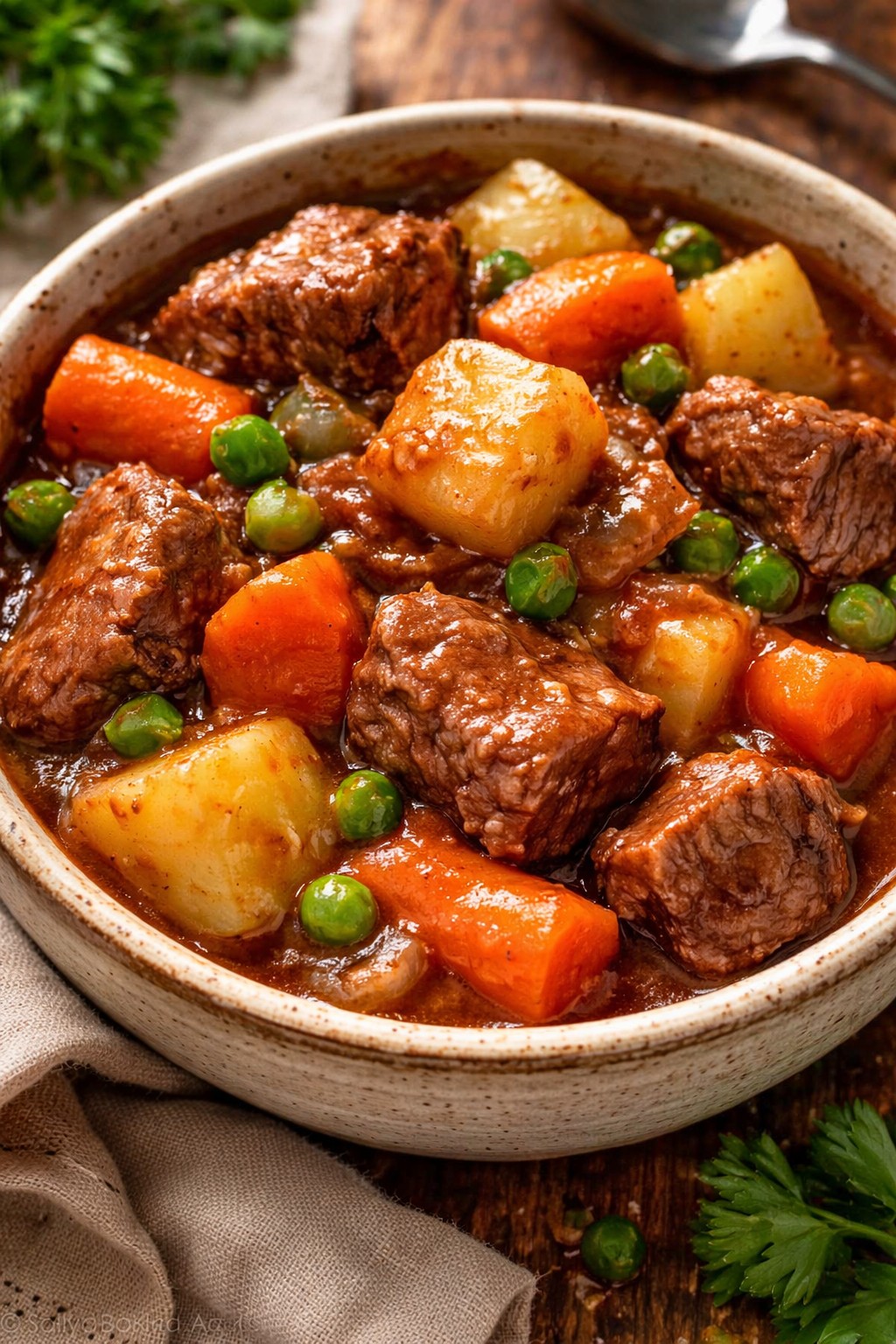 Nota: Para dar más sabor al guiso podemos añadir a la carne y verduras un vasito de vino y lo dejamos evaporar unos cinco minutos, antes de añadir el agua al guiso.