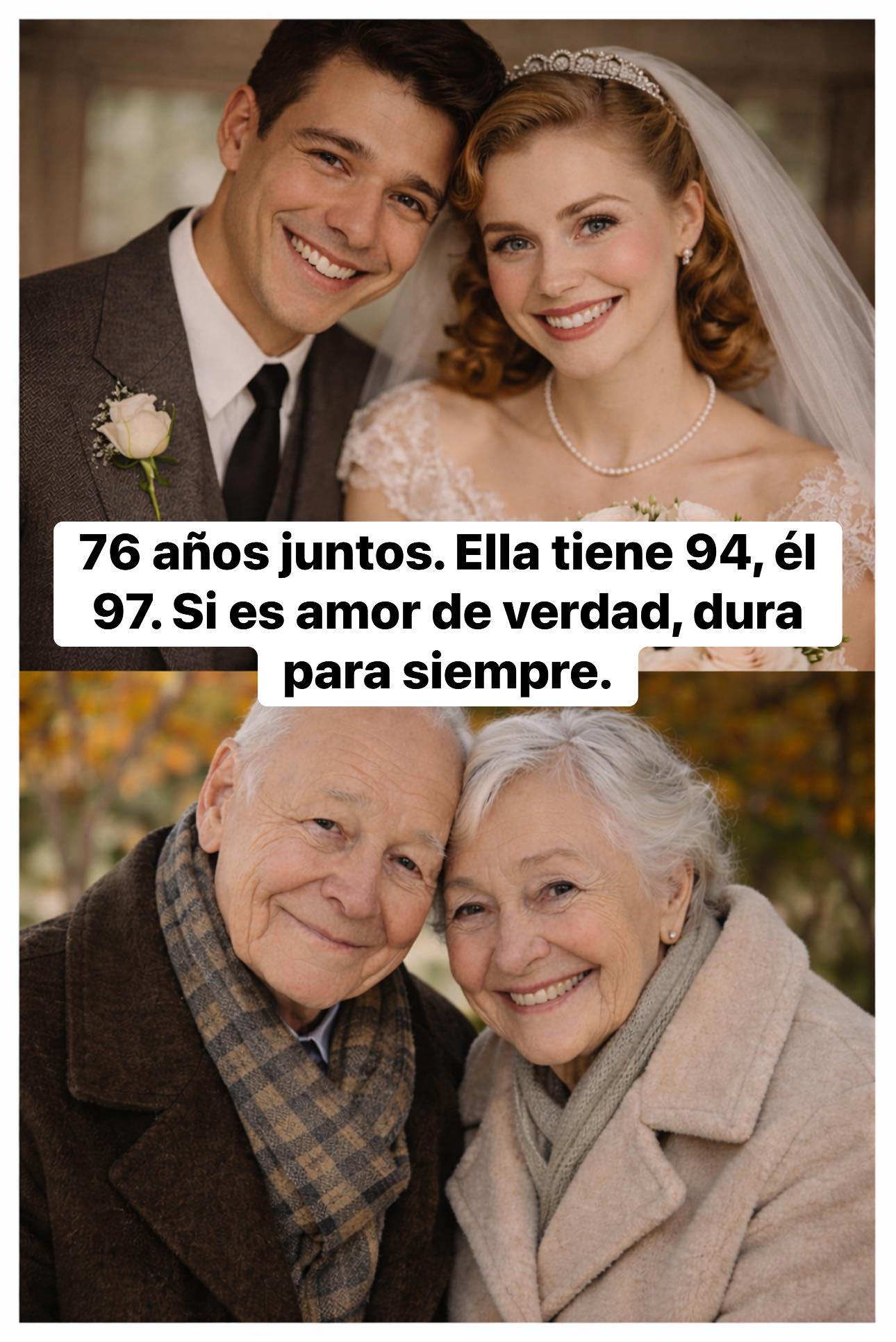 Hoy ella tiene 94 y él 97. Sus rostros guardan el tiempo, pero su sonrisa guarda algo más fuerte: la prueba de la presencia. No la prueba de una vida perfecta, sino de una vida compartida. Porque el amor de verdad no es una promesa de un solo día; es una promesa sostenida, en lo cotidiano, una y otra vez.