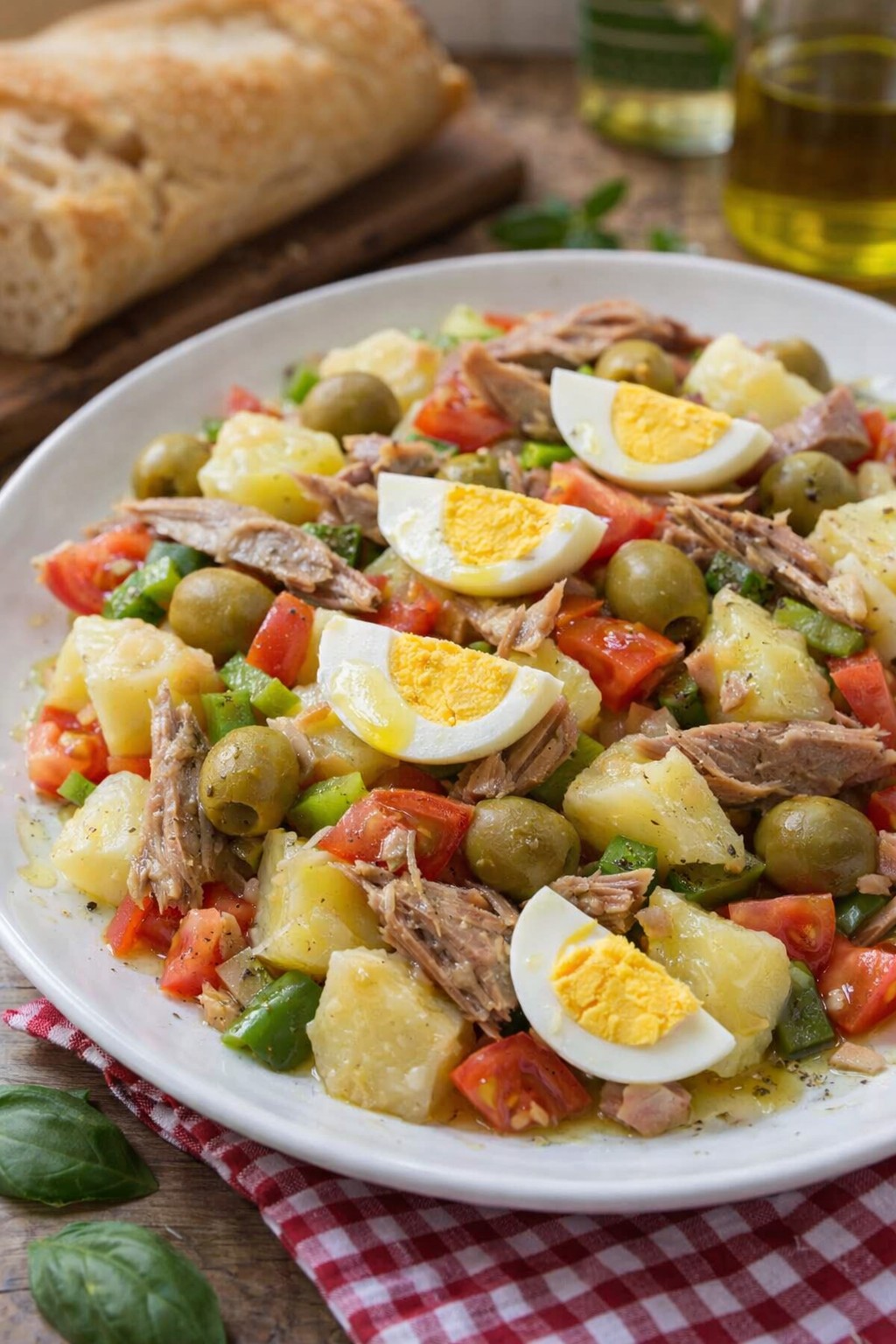 Una ensalada equilibrada, fresca y muy sabrosa, donde la patata suave se mezcla con el atún jugoso y el toque salino de las aceitunas.