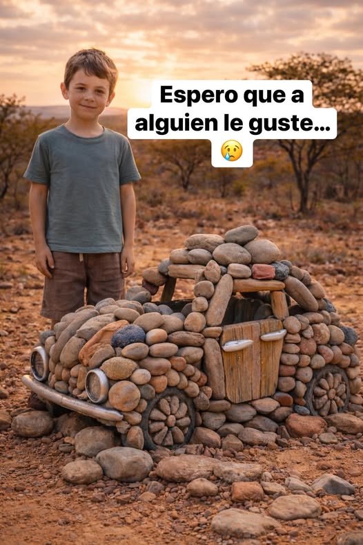 Nadie vio el inicio. Nadie lo vio juntando piedras durante días, guardándolas en los bolsillos, cargándolas con las manos, separando las “mejores” para el final. Nadie lo vio imaginando faros, una puerta, ruedas—imaginando algo posible incluso en un lugar donde casi nada parece nacer. No tenía herramientas. No tenía pintura. No tenía taller. Tenía tiempo, curiosidad y ese valor silencioso de quien crea porque lo necesita.