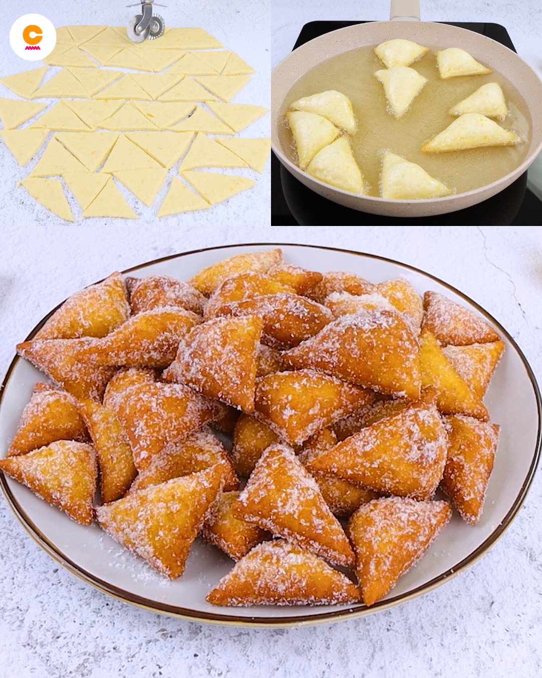 Per i triangoli, invece, abbiamo mescolato insieme farina, zucchero, lievito per dolci, latte, succo e scorza di arancia. L’impasto sarà steso così da ricavarne poi dei triangoli, che saranno poi fritti in olio ben caldo fino a doratura e passati anche nello zucchero semolato, prima di servirli. Ecco i passaggi per realizzare delle frittelle all’arancia davvero sfiziose, ideali per la merenda o da preparare per arricchire un buffet di dolci.