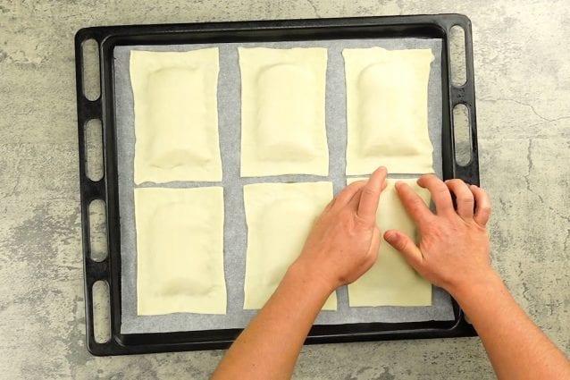 Cortar el hojaldre en rectángulos y colocarlo encima de las manzanas: adherir presionando con los dedos.3.