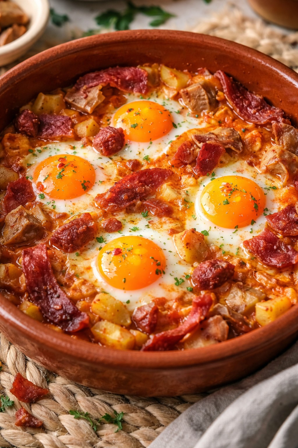8. Retira del fuego, espolvorea perejil fresco y deja reposar 2 minutos para que los jugos se asienten. Sirve al momento con pan para mojar. Consejo: si quieres yema más hecha, prolonga 1–2 minutos la cocción.
