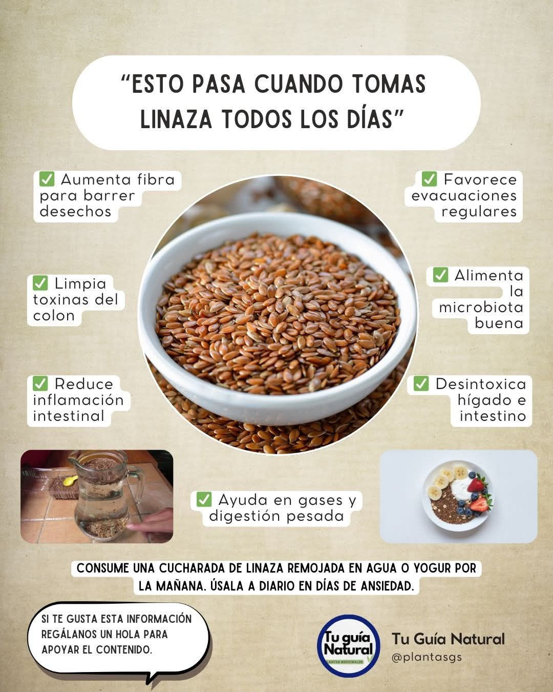 omega-3 y lignanos, ayuda a regular el tránsito intestinal, mejorar la digestión, reducir inflamación y mantener equilibrados los niveles de colesterol y azúcar en sangre. Tu guía natural señala que consumir linaza a diario no es un remedio mágico, pero sí un hábito sencillo que fortalece tu bienestar de manera integral.