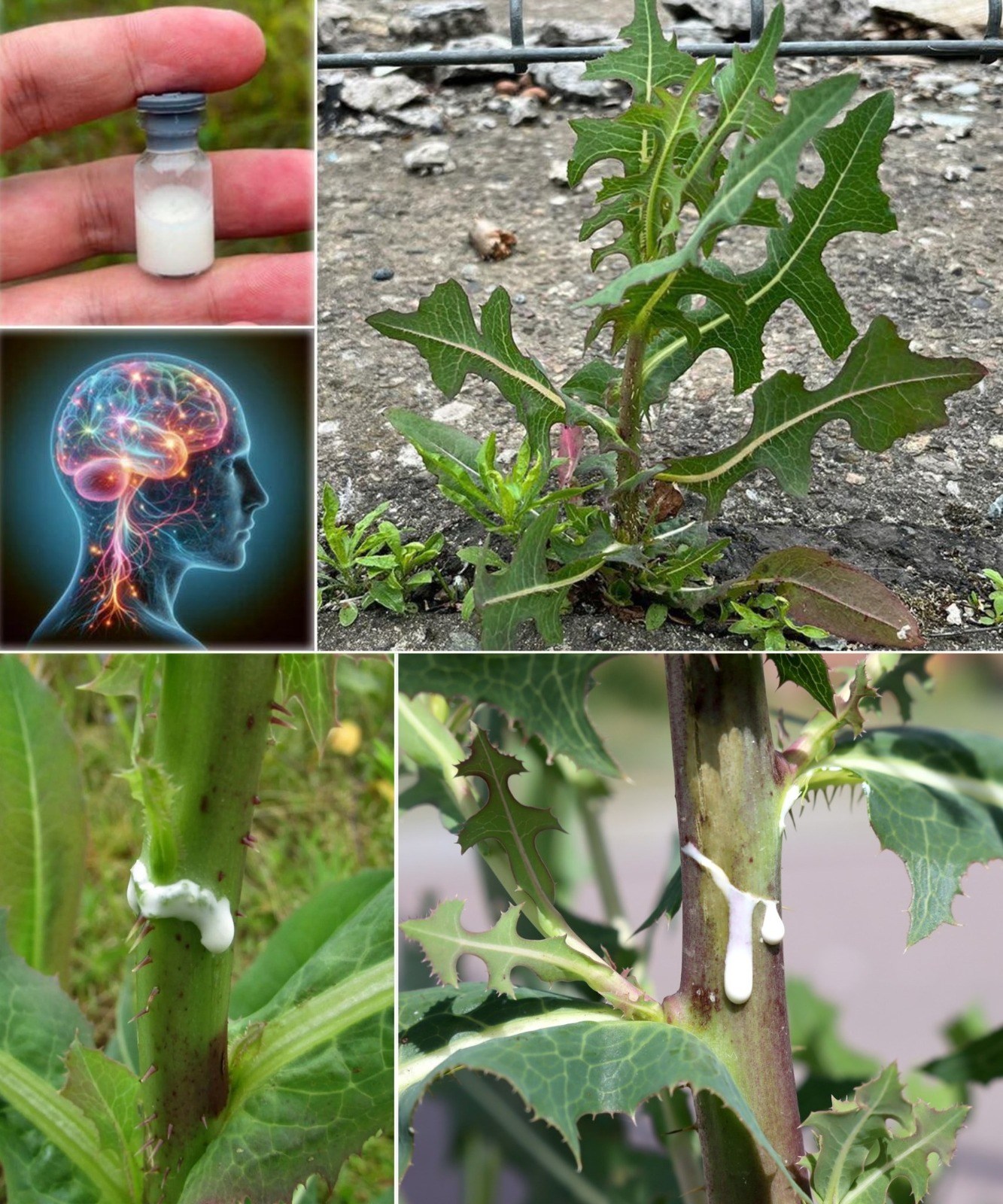 1️⃣ Identifique a planta — Ela cresce em campos e à beira de estradas, com folhas e caules longos, verde-azulados, que exsudam seiva branca quando quebrados.
