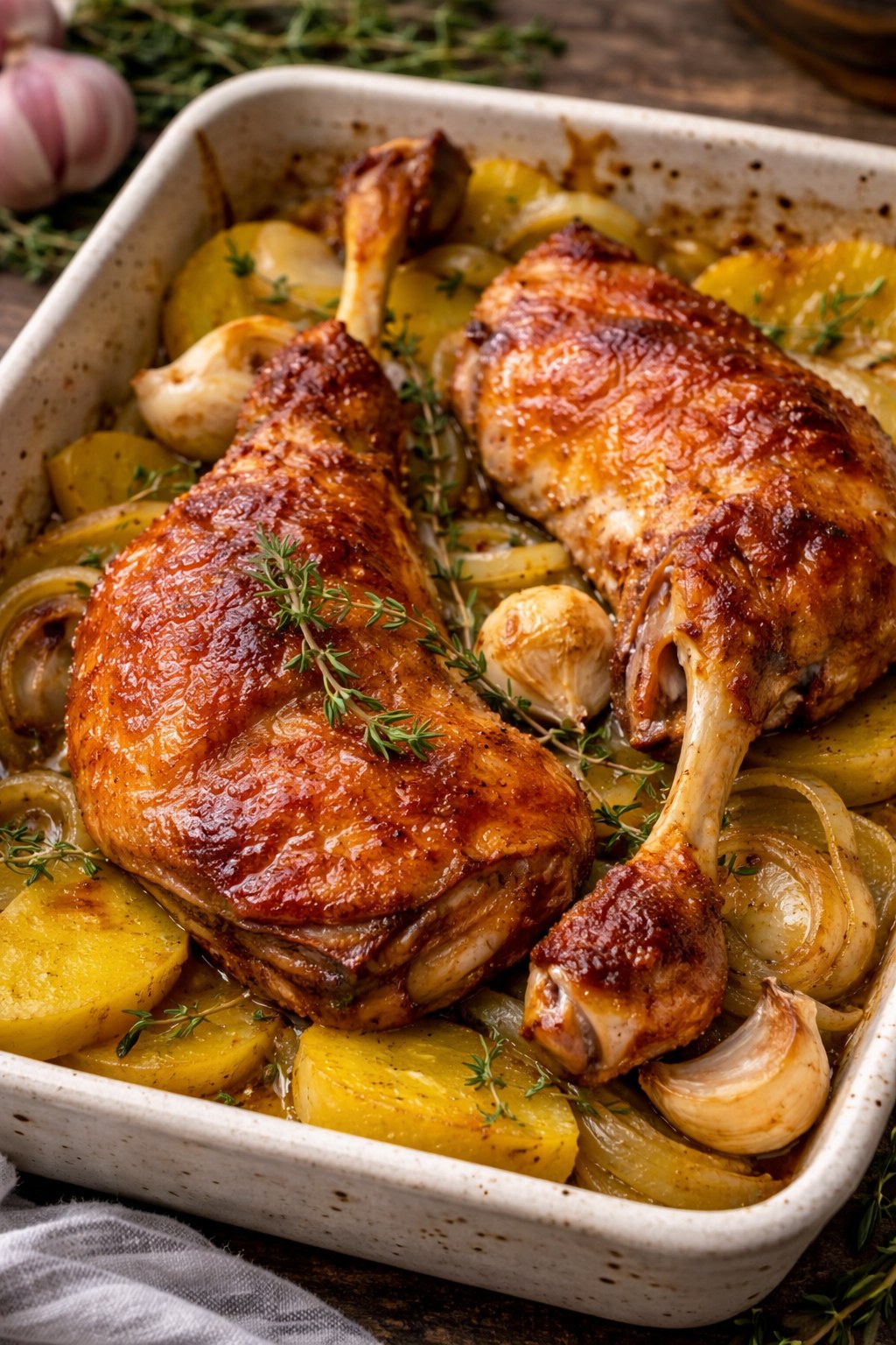 4. Aplasta los dientes de ajo con piel y repártelos sobre la cama de patata y cebolla junto con las hojas de laurel y las ramitas de hierbas reservadas.