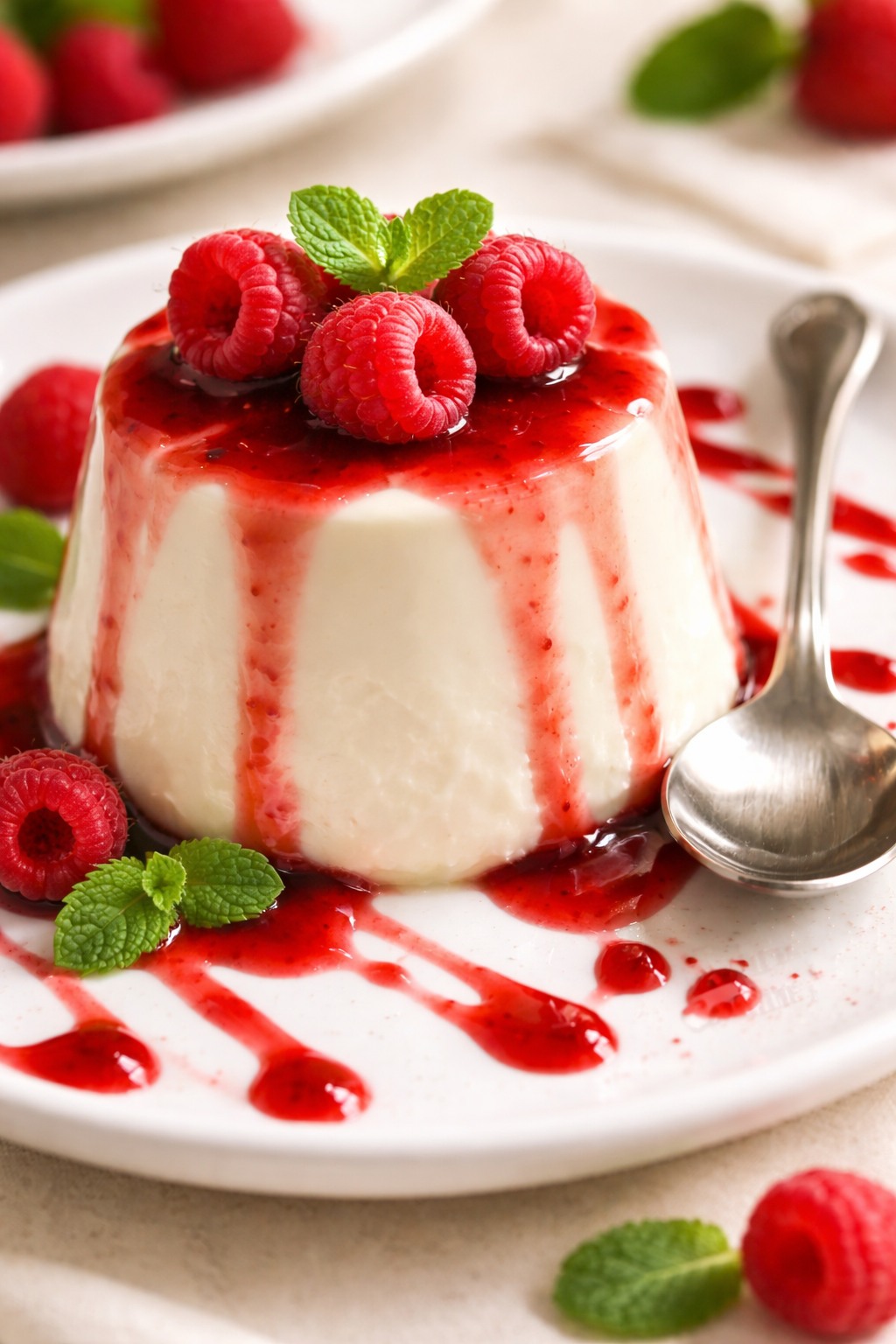 Cuando vayamos a servir, desmoldamos la panna cotta, le echamos por encima el puré de frambuesas y lo servimos con un par de frambuesas a modo de decoración. ¡Exquisita!