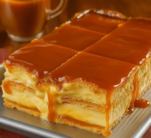 El caramelo fluye lentamente, impregnando cada capa con su dulzura tostada.
