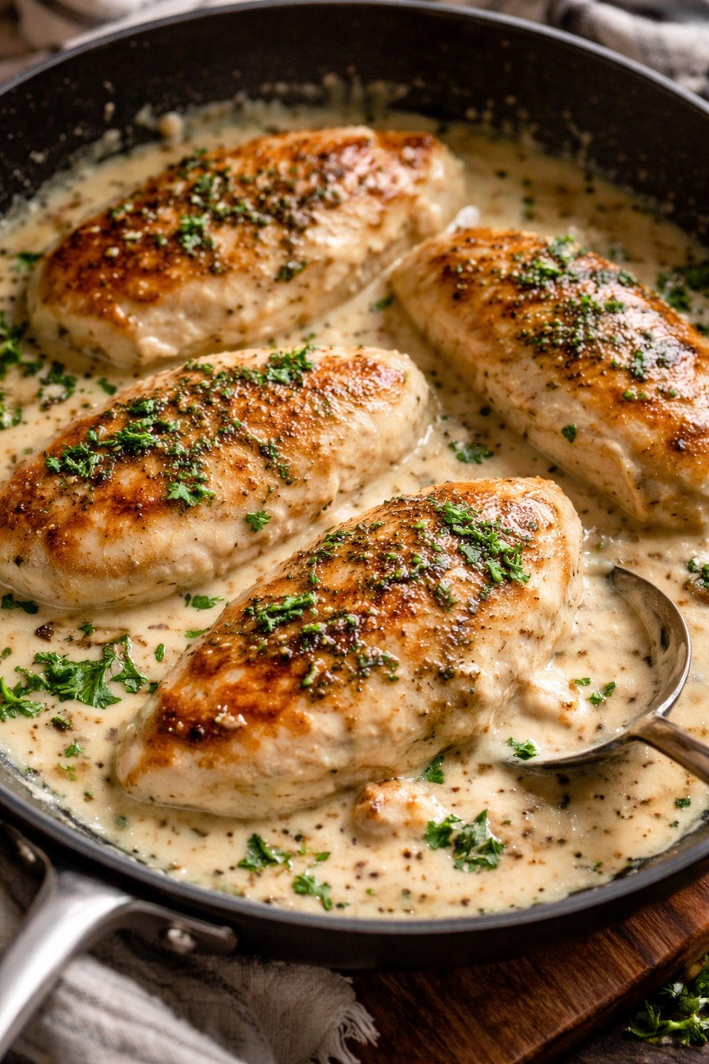 Jugosa pechuga de pollo dorada a la sartén, coronada con una sedosa salsa de queso y acompañada de patatas asadas crujientes por fuera y tiernas por dentro. Un plato reconfortante que combina técnica sencilla y sabor intenso, ideal para una comida de diario con toque especial o para quedar bien con invitados sin complicarse. La salsa, cremosa y aromática, realza el pollo sin tapar su sabor, mientras las patatas se hornean solas hasta quedar perfectas. Todo en una receta práctica, equilibrada y lista en menos de una hora.