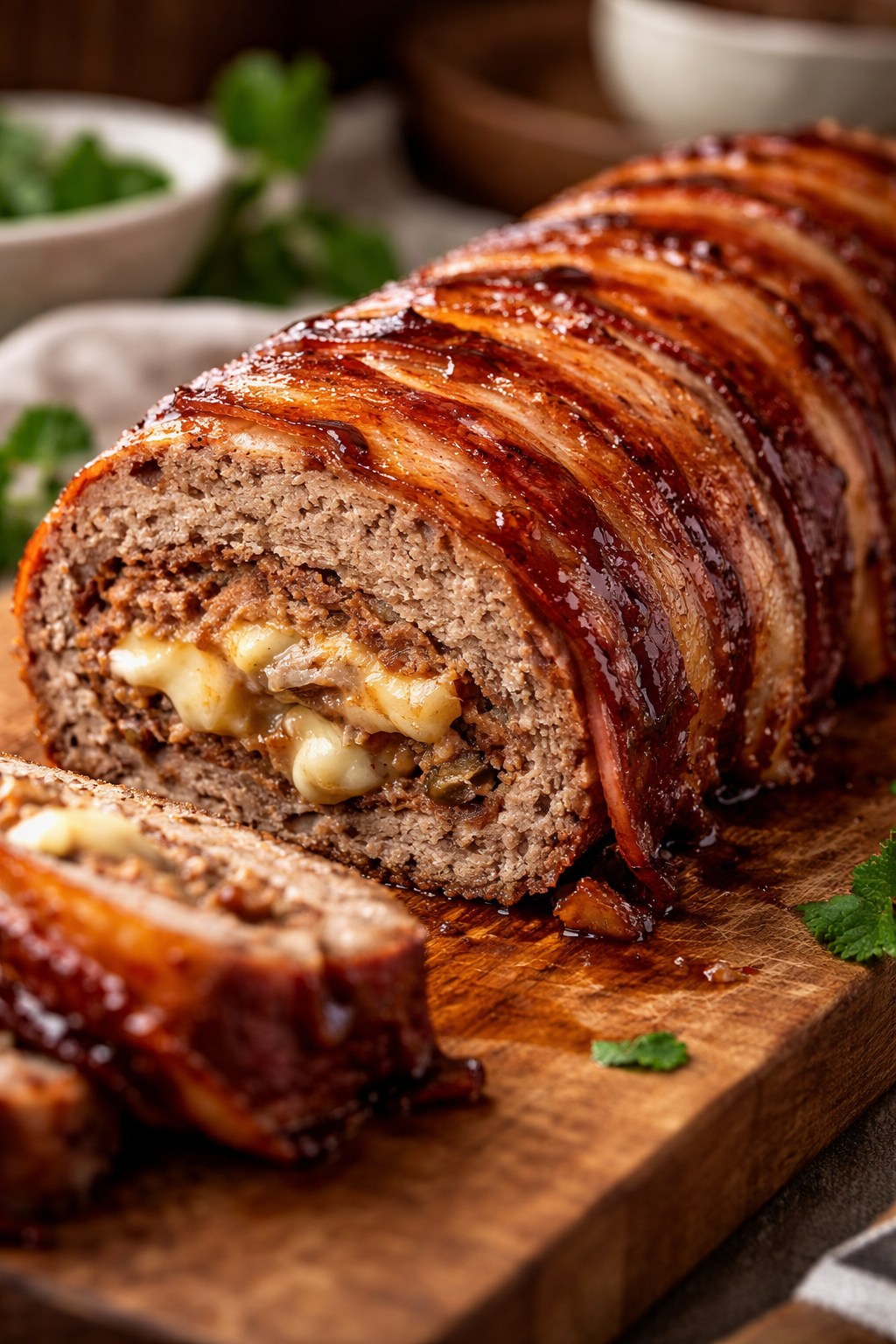 Vertemos el contenido del bol en una fuente para horno y lo damos forma de rollo, abriendo un surco longitudinal, no demasiado profundo, para echar el queso. Cerramos de nuevo el rollo con las manos y lo cubrimos con lonchas de bacon.