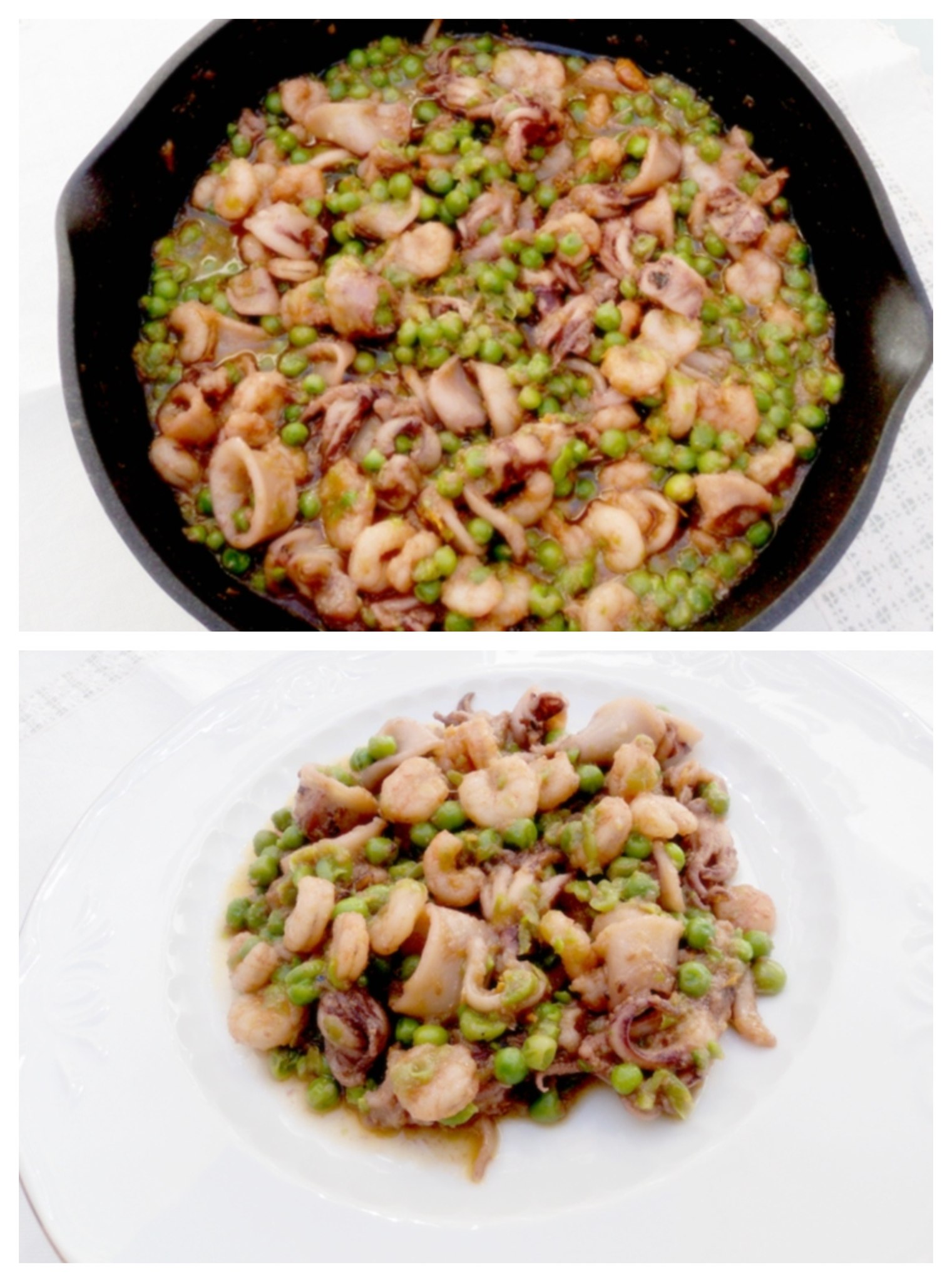 Preparación de la Sepia o calamares con Guisantes y Gambas en Salsa: