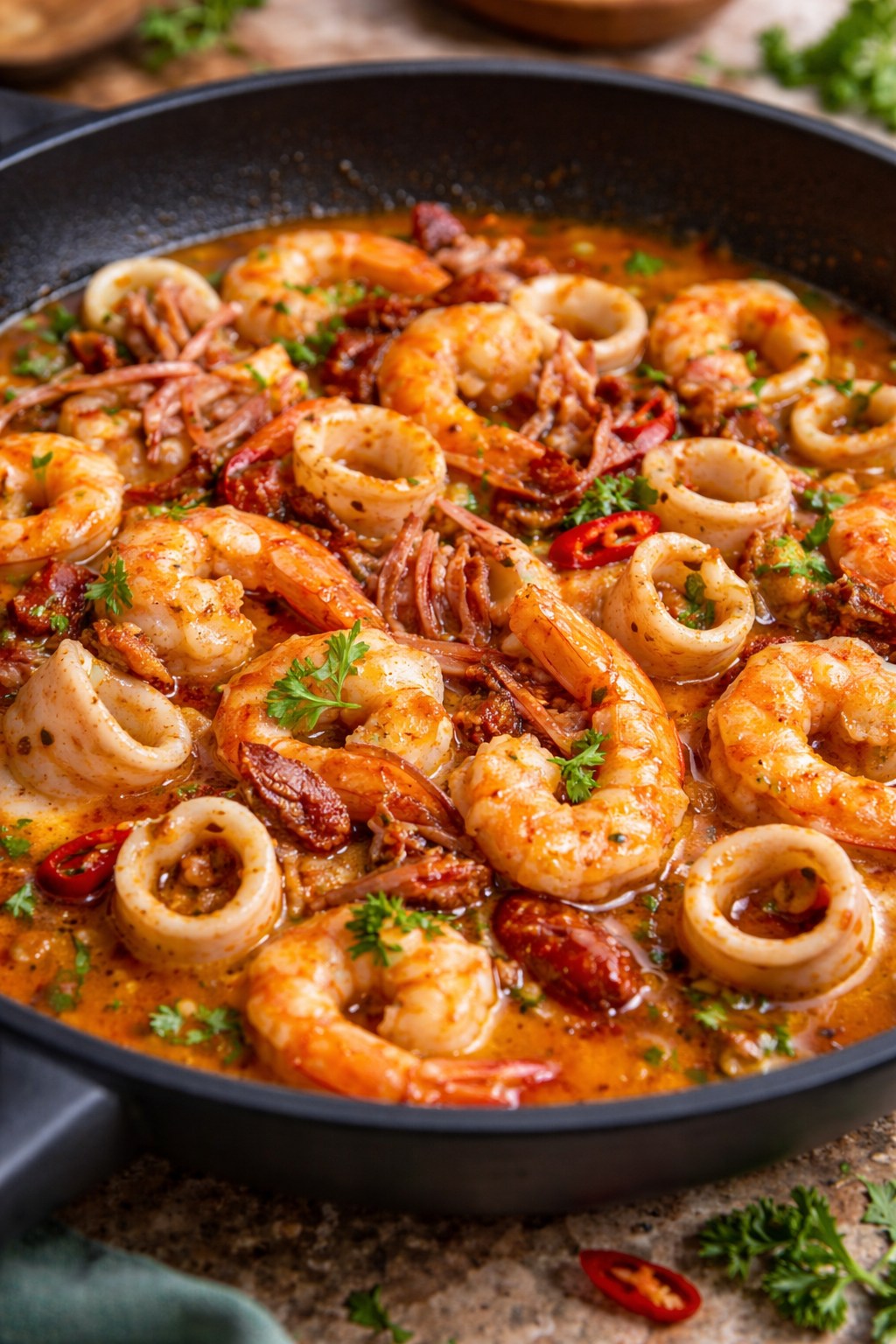 9. Ajusta y reposa: prueba de sal y pimienta. Retira el laurel. Deja reposar 5 minutos con la olla tapada; así los sabores redondean y el marisco permanece jugoso.