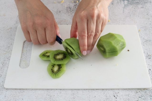 Después de cortar los extremos, pelamos los kiwis y los cortamos en rodajas finas.11y luego dividirlos por la mitad, dejando solo uno entero para poner en el centro de la tarta.