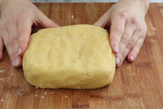 Continuar amasando hasta obtener una masa suave y que no se pegue a las manos.4Luego envuélvalo en film transparente y aplánelo ligeramente con un rodillo. Por último, déjalo reposar en el frigorífico durante al menos una hora.