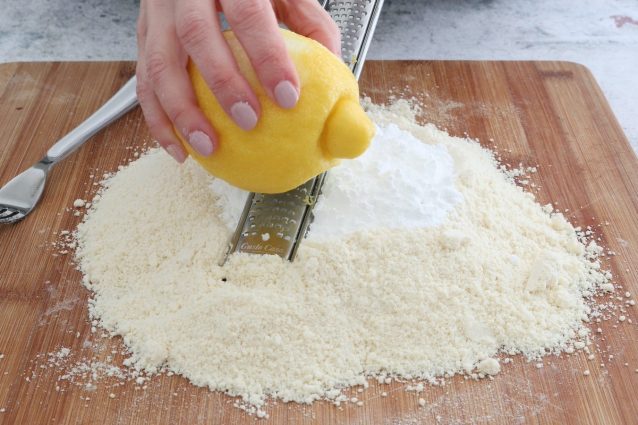 Luego transfiere la mezcla a una superficie de trabajo, agrega el azúcar glas y ralla la ralladura de un limón.2.