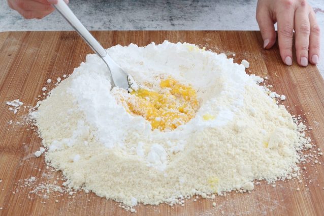 Ahora crea un hueco en el centro de la harina y rompe los huevos en él.3. Incorpóralos con un tenedor, luego pasa a trabajar todo con las manos.