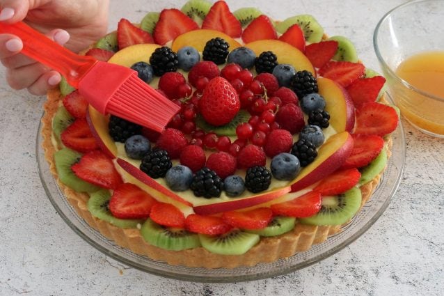 Después de reposar en el frigorífico, la masa quebrada quedará suave, elástica y muy fácil de extender, lista para < a i=3>cocción al horno: al ser sin levadura bastará con pincharlo con las púas de un tenedor para evitar que se hinche durante la cocción, sin necesidad de taparlo con legumbres secas. Luego solo queda rellenar la base con lanatilla, que debe quedar densa para evitar que se derrame al cortar, y decorar la tarta con la fruta elegida, en nuestro caso kiwi, fresas, melocotones y frutos del bosque. Para evitar que la fruta se ennegrezca, basta con untarla con mermelada de albaricoque, diluida con un poco de agua y diluida al fuego: un excelente sustituto casero de la gelatina comestible que deja la tarta brillante y apetitosa.