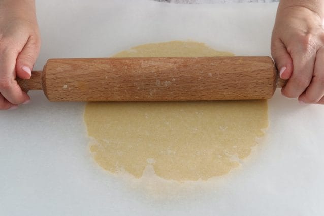 Una vez pasado el tiempo de reposo, sacamos la masa quebrada del frigorífico y la colocamos entre dos hojas de papel de horno. Con la ayuda de un rodillo, extender un disco redondo con un espesor de aproximadamente 4-5 mm.8.