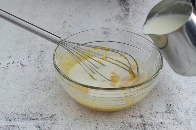 En un bol aparte, trabajar las yemas con el azúcar durante unos minutos, luego añadir la harina tamizada y mezclar enérgicamente con una batidora de mano o eléctrica. Por último verter la leche hirviendo.6, siempre continuando mezclando.