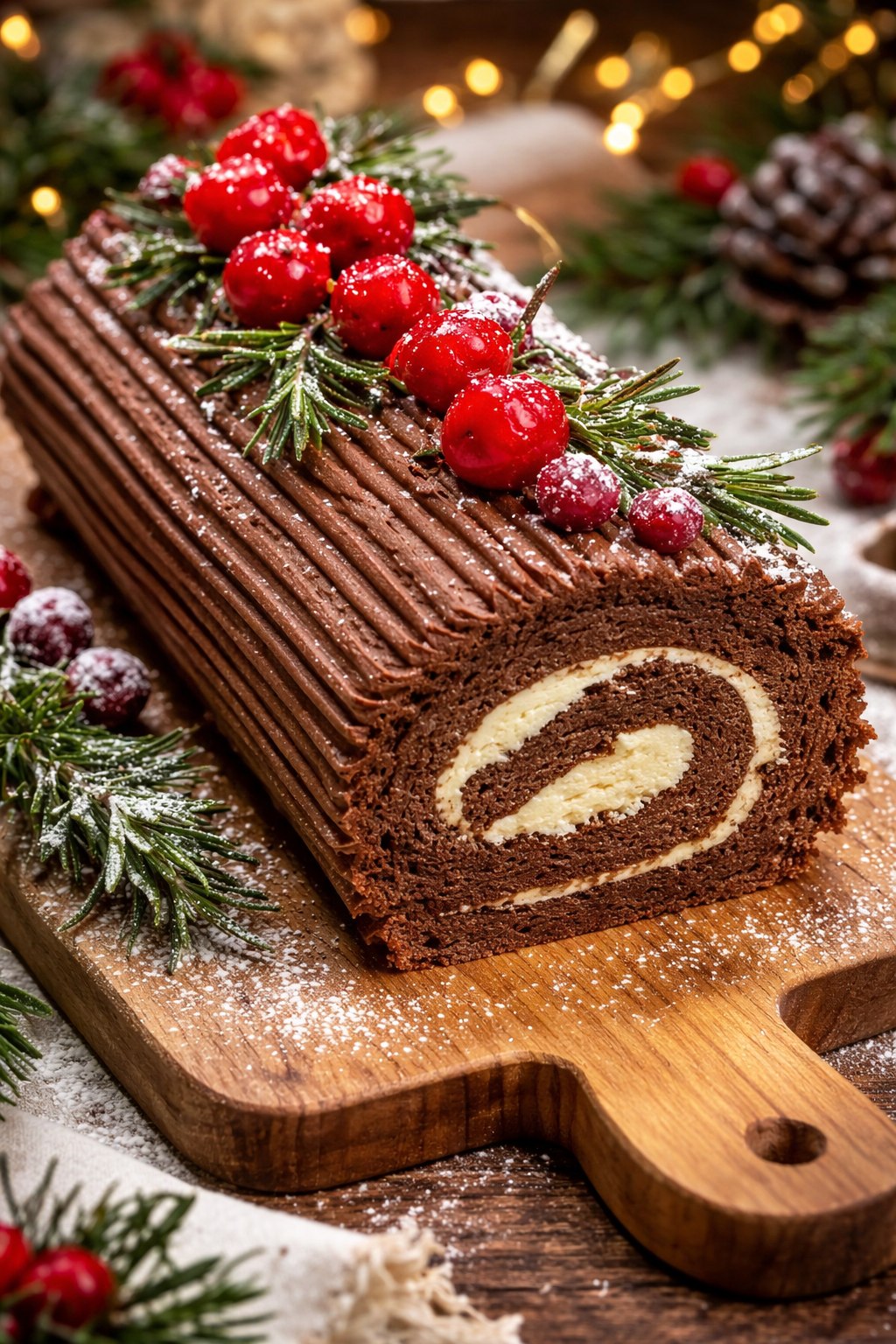 Desenrollamos el bizcocho, lo cubrimos con la crema de chocolate, reservandonos un poco para decorar al final. Volvemos a enrollarlo, lo cubrimos con una capa de chocolate. Hacemos unos adornos con un tenedor y colocamos las guindas adornándolo.